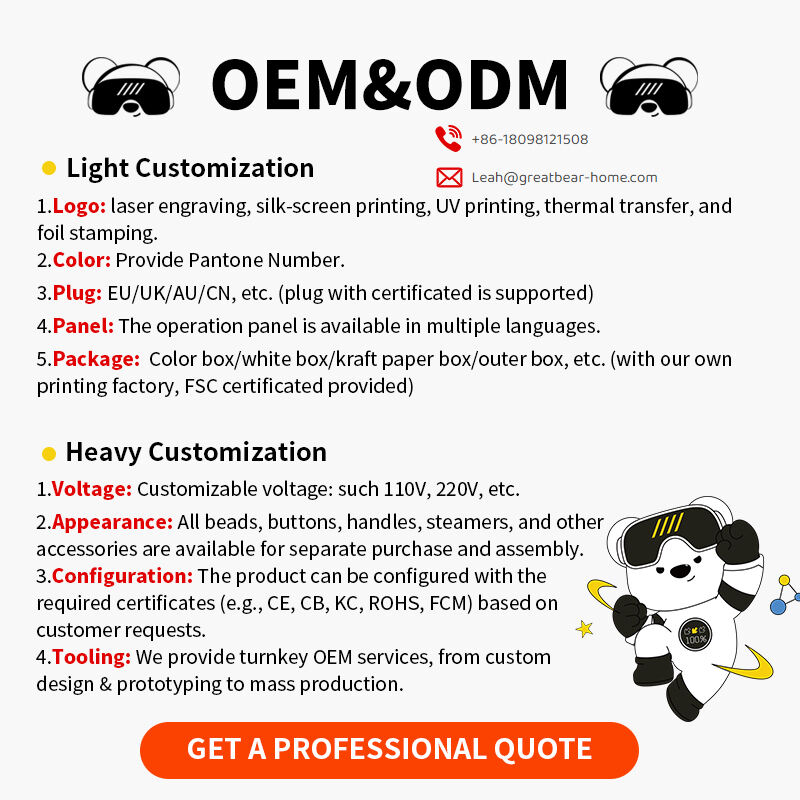 Greatbear Home se digitale ryskooktoestelle verstaan die behoeftes van verskeie kliënte en poog om hierdie behoeftes te bevredig, vanaf aanpasbare kleurkeuses tot aanpasbare kapasiteit wat wissel van klein skale van 1,8 L tot groot skale van 10 L vir gesins- en kommersiële gebruik. Vir besighede is OEM-/ODM-dienste beskikbaar, waar u u eie logo kan plaas, u kookprogramme kan aanpas en die taal van u beheerpanele kan kies. Elke digitale ryskooktoestel word geskep met die doel om u vereistes te bevredig, waar ons span saam met u werk om u aanpassingskonsepte te verwesenlik.